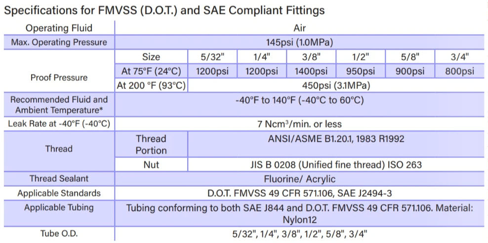 Composite DOT push-to-connect fittings are designed only for use in applications where air is ulitized as an operating fluid. One touch connection reduces installation time and cost. Rugged ultraviolet and vibration resistant composite body. Various shapes and configurations to meet vehicle applications and make installations easier.